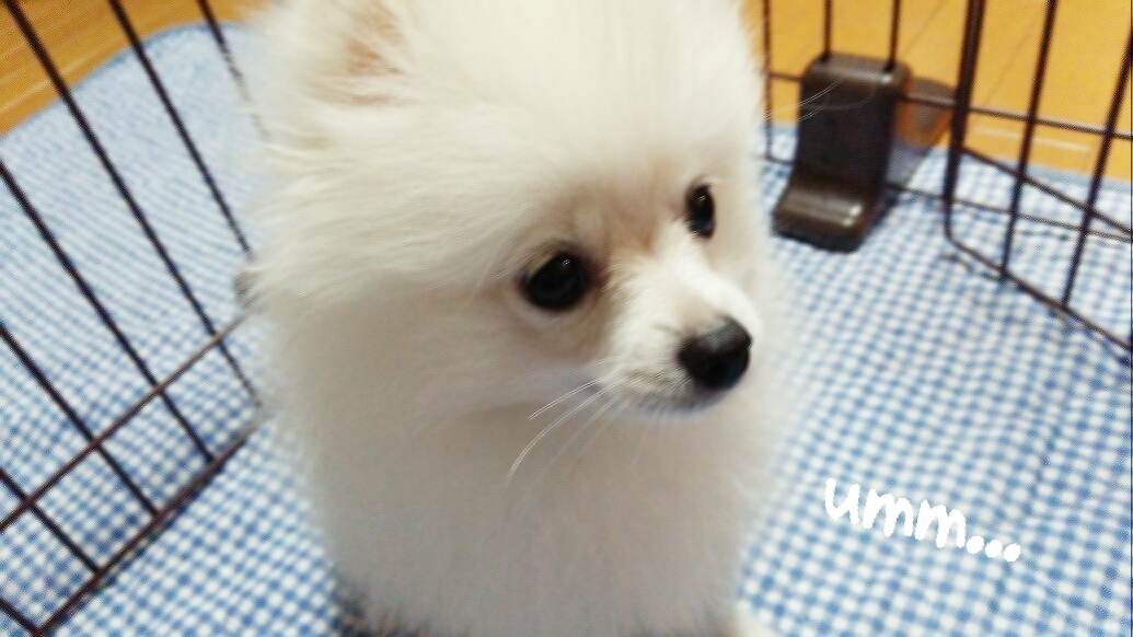 白ポメ。男の子。名前はマルル…らしい:-) 噛み癖がひどい…w